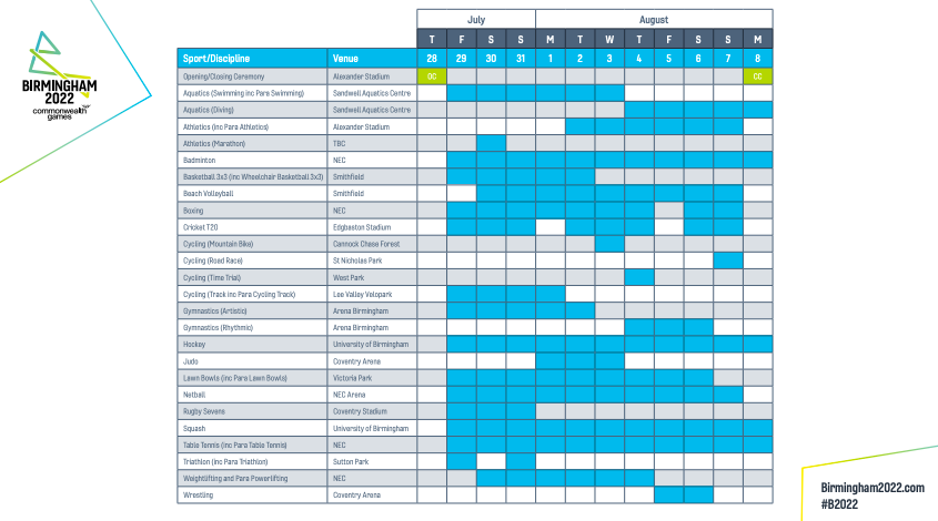 Birmingham2022.com #b2022 july august t f s s m t w t f s s m sport/discipline venue 28 29 30 31 1 2 3 4 5 6 7 8 opening/closing ceremony alexander stadium oc cc Anticipation is mounting ahead of birmingham 2022, following england's historic win at the last tournament in the gold coast. A total of 19 sports are set to take place in 2022 commonwealth games and 264 events to happen in these games. The group stages will be held until august 4. The sporting action will start in style on friday 29 july, with netball taking place from friday 29 july to sunday 7 august 2022 at the nec, birmingham.
